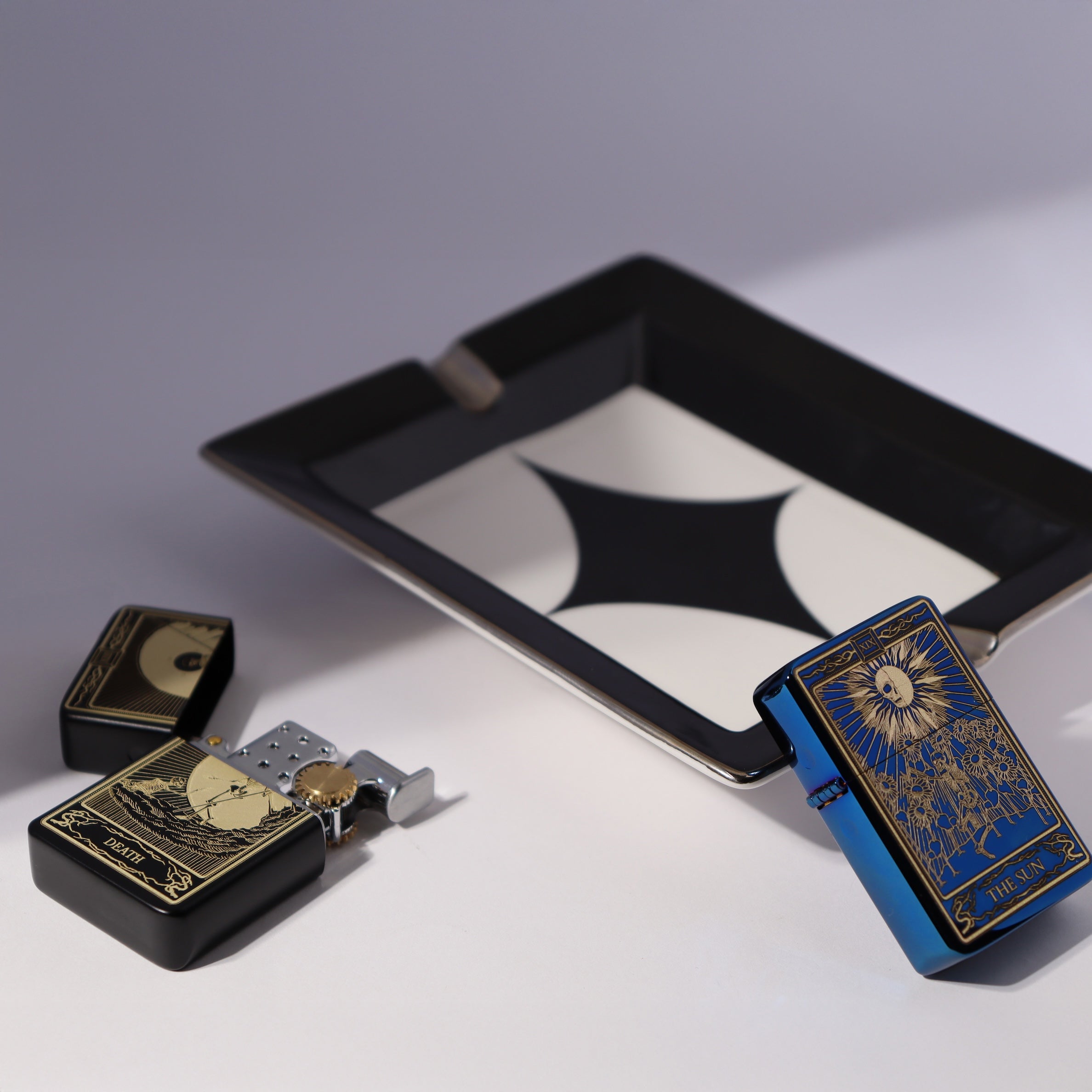 We make illustrated pieces for the home, drawn from a personal archive of symbols and stories. Our ashtrays and original tarot deck lighters are produced in small batches. The deck itself is a long-form project — each Major Arcana card illustrated over the course of three years, with the remaining cards still in progress.